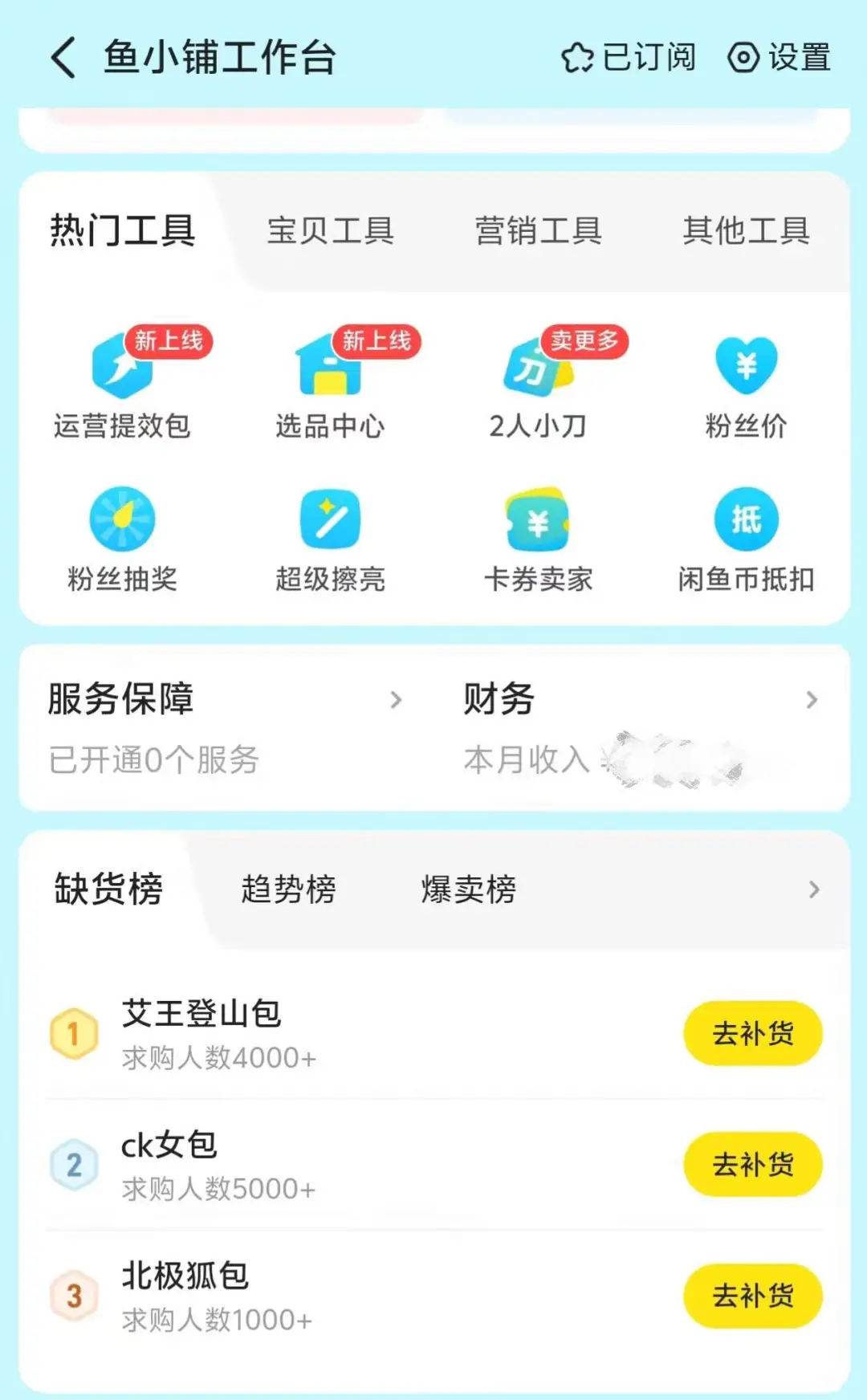 此外,闲鱼还为鱼小铺卖家提供了运营提效包、选品中心、粉丝抽奖、2人小刀、粉丝价等多个工具选项。其中,运营提效包主打同行热卖趋势洞察、为卖家铺货进行优化。在实现商品批量删除、上下架和改价的前提下,发布上限被提升至3000个。当然,这需要付费——原价每年258元,现阶段开通每年支付198元,连续包年为188元。