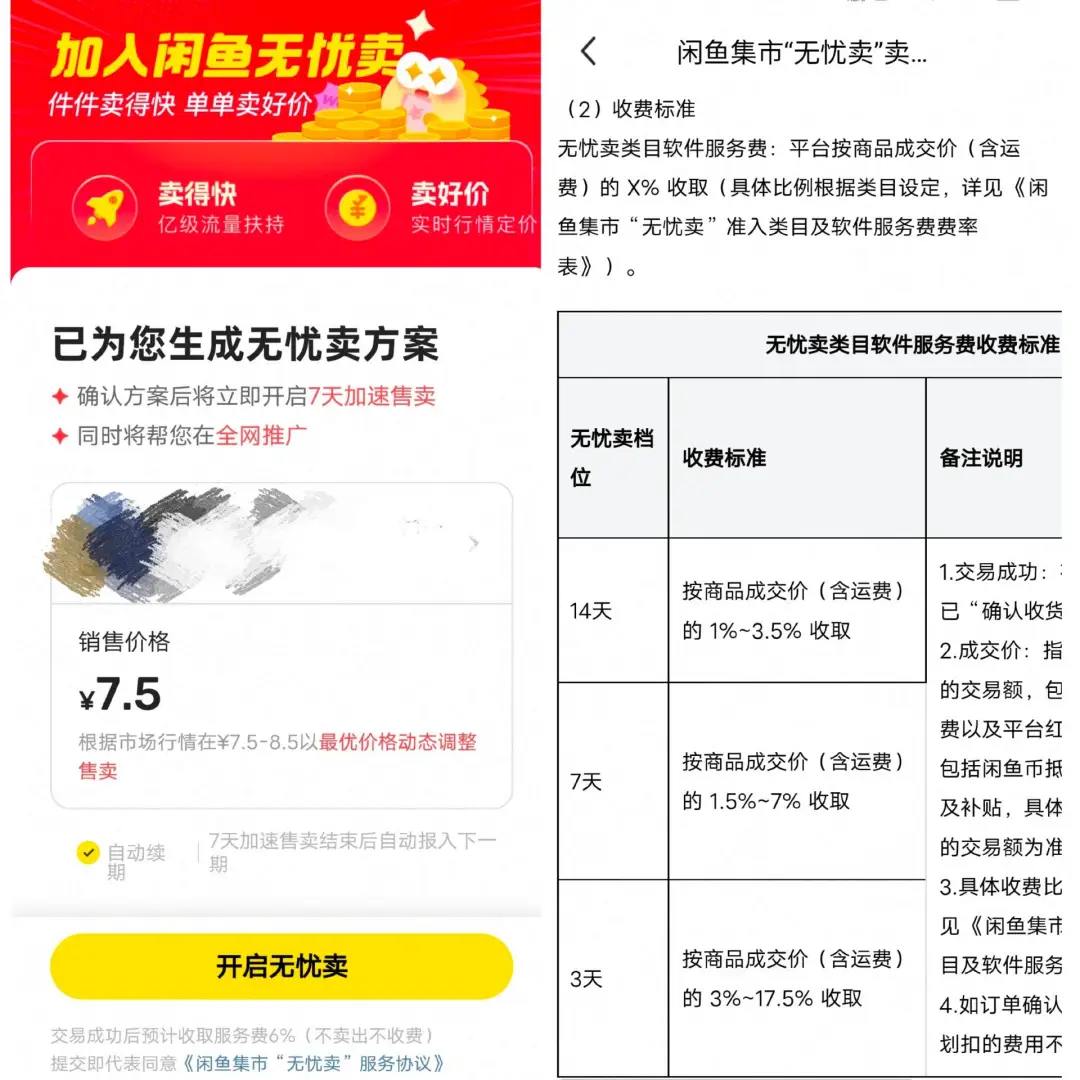 以“无忧卖”为例,闲鱼为卖家提供定价智能分析和流量加权支持,无忧卖14天、7天、3天对应的收费标准分别为商品成交价的1%-3.5%、商品成交价的1.5%-7%、商品成交价的3%-17.5%,具体比例根据类目设定。