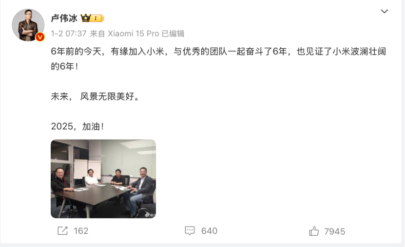 但当下,今时不同往日了。2025年1月2日,卢伟冰发了一条微博,庆祝自己加入小米6周年。