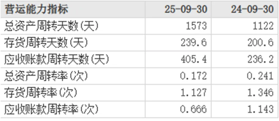 盈利方面,2025年前三季度毛利率由2024年同期的39.75%收窄至36.04%。营运能力方面,公司总资产周转天数由1122天大幅攀升至1573天,其中应收账款周转天数更是从上年同期的236天飙升至405天,近乎翻倍。这一变化表明客户回款周期明显拉长,公司资金回笼能力显著弱化。