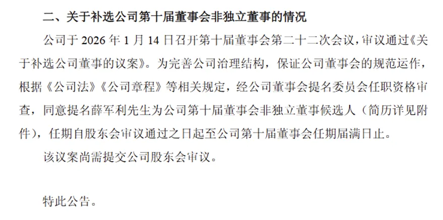 在董事长辞职的同时,公司迅速推进董事补选。1月14日,浪潮软件以通讯方式召开第十届董事会第二十二次会议,审议通过相关议案,同意提名薛军利为非独立董事候选人,任期至本届董事会届满。
