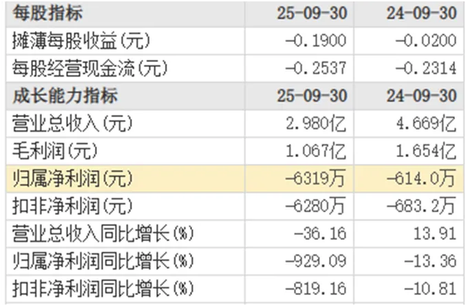 单季度表现同样承压。2025年第三季度,公司单季净利润亏损6319万元,亏损幅度较上年同期明显扩大。收入下滑带来的毛利收缩,叠加费用端的刚性支出压力,成为拖累当期业绩的主要因素。