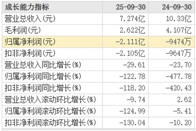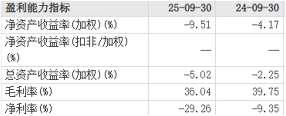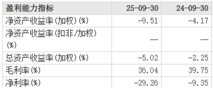 利润端上,2025年前三季度,公司归属于母公司股东的净利润为亏损2.11亿元,较上年同期的-9474万元,亏损扩大;净利率则由-9.35%进一步恶化至-29.26%,亏损与收入规模之间的“剪刀差”持续扩大。