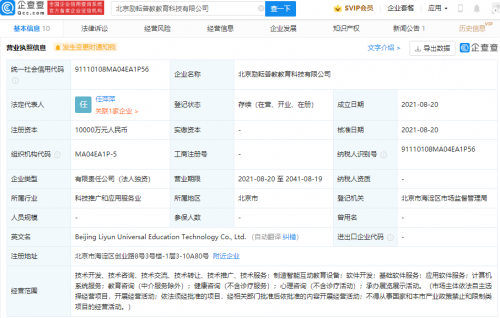 【TechWeb】企查查APP显示,8月20日,北京励耘普教教育科技有限公司成立,法定代表人为任萍萍,注册资本1亿元人民币,经营范围包含:制造智能互动教育设备;软件开发;基础软件服务;应用软件服务等。