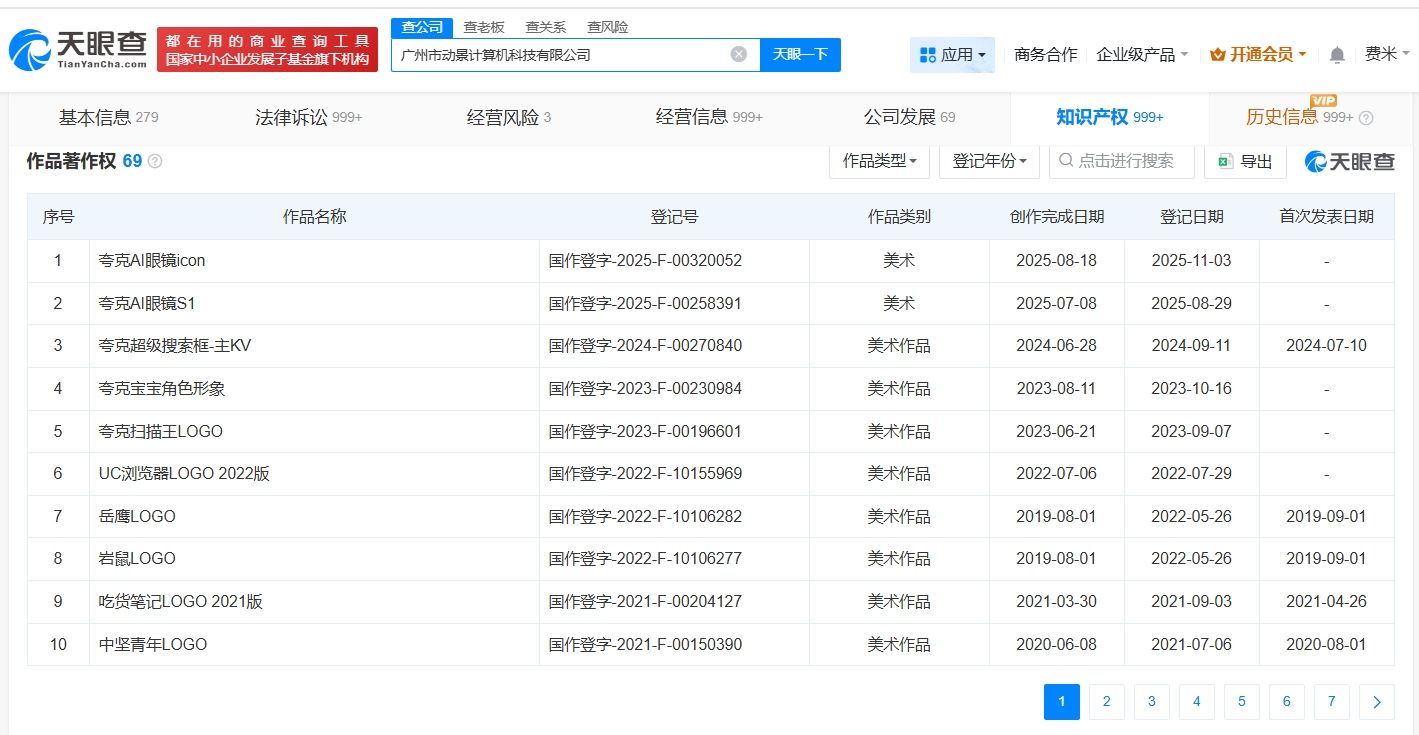 天眼查App显示,近日,UC浏览器关联公司广州市动景计算机科技有限公司登记“夸克AI眼镜icon”作品著作权,今年8月,该公司已登记“夸克AI眼镜S1”作品著作权,上述著作权作品类别均为美术。