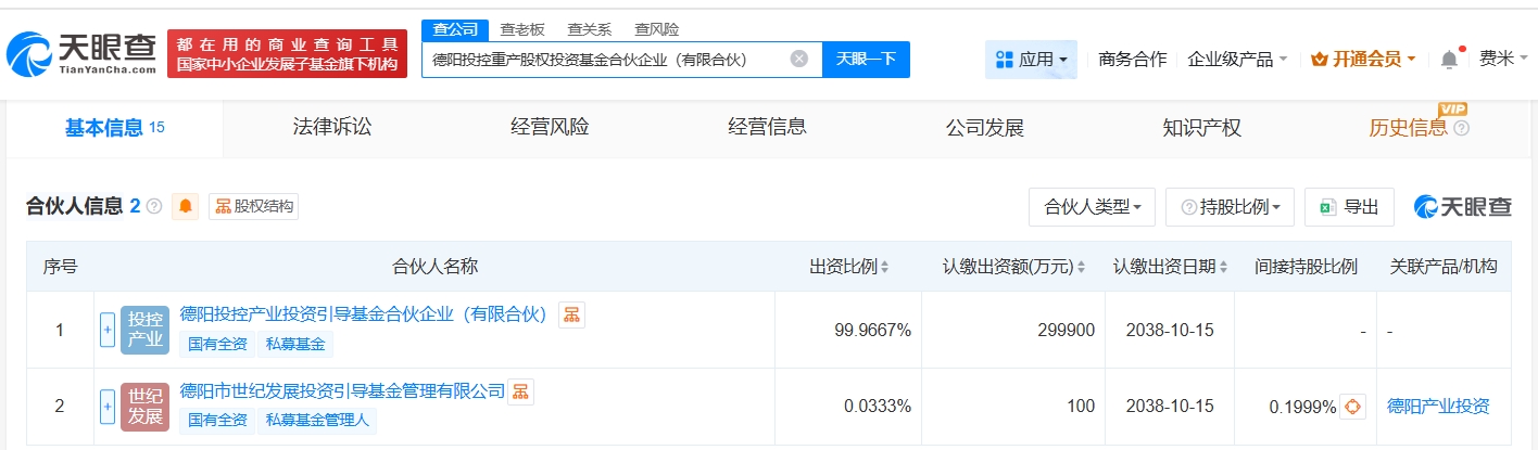 天眼查App显示,近日,德阳投控重产股权投资基金合伙企业(有限合伙)成立,执行事务合伙人为德阳市世纪发展投资引导基金管理有限公司,出资额30亿人民币,经营范围为以私募基金从事股权投资、投资管理、资产管理等活动,私募股权投资基金管理、创业投资基金管理服务,创业投资,由德阳投控产业投资引导基金合伙企业(有限合伙)、德阳市世纪发展投资引导基金管理有限公司共同出资。