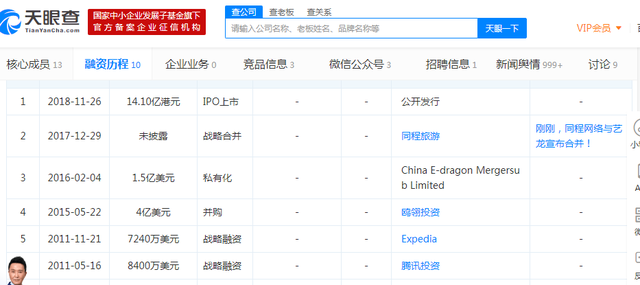 与携程不同的是,同程艺龙依靠微信生态,迅速成长为“小程序第一股”。根据天眼查App融资历程信息显示,18年11月,同程艺龙于港股IPO上市,2011年,腾讯投资曾经战略投资8400万美元。依赖于腾讯为其所提供的流量入口,同程艺龙持续在微信生态系统内布局,从而形成自身的流量基本盘。