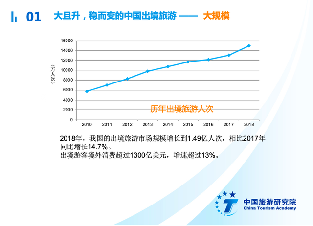 根据中国旅游研究院发布的《中国出境旅游发展年度报告2019》显示2018年我国出境游已经达到1.49亿人次,相比2017年同比增长14.7%,出境游客境外消费超过1300亿美元,增速超过13%。