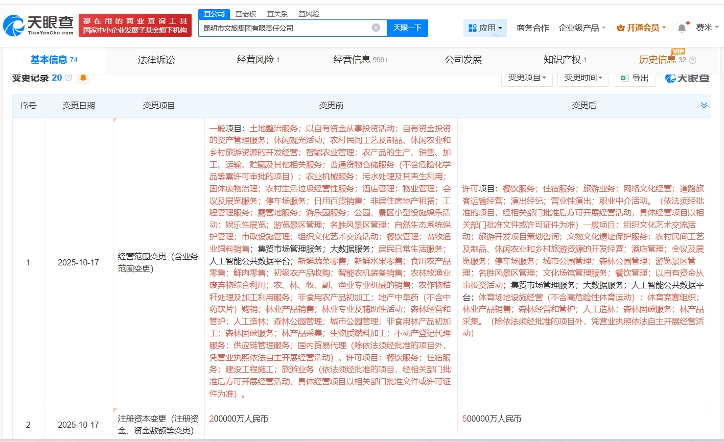 天眼查App显示,近日,昆明市文旅集团有限责任公司发生工商变更,注册资本由20亿人民币增至50亿人民币,增幅150%。