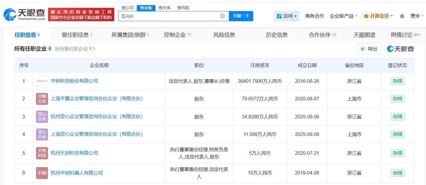 天眼查任职信息显示,王兴兴名下关联6家企业,包括宇树科技股份有限公司、上海宇翼企业管理咨询合伙企业(有限合伙)、杭州宇树机器人有限公司等,王兴兴在上述企业中担任执行董事等职务,版图涉及科技、管理咨询等领域。