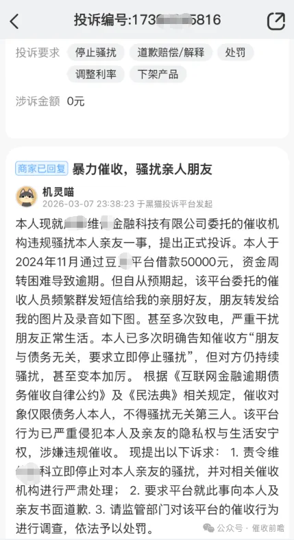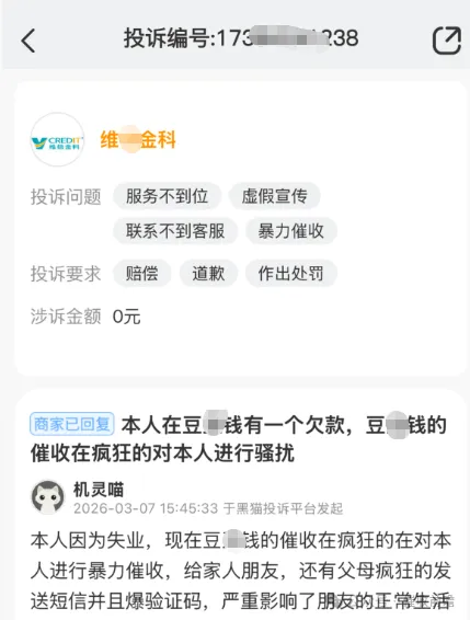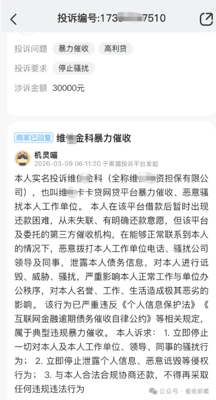 3 月 9 日,某债务人发起实名投诉,此次涉诉金额达 3 万元,投诉直指维信金科(当事人标注全称为维资担保有限公司)旗下维卡卡贷平台的催收行为进一步升级。据悉,当事人从未失联且有明确的还款意愿,催收机构在能够正常联系到本人的前提下,刻意将骚扰范围延伸至其工作单位,恶意拨打单位电话,向公司领导与同事泄露当事人的债务信息,还伴随诋毁、威胁等言行,不仅严重破坏了公司的正常办公秩序,更对当事人的个人名誉、职业发展造成了难以挽回的恶劣影响,当事人要求平台立即停止侵权、合规协商还款。值得注意的是,三起投诉均显示 “商家已回复”,但当事人反映的暴力催收问题并未得到实质性解决,违规催收行为的持续性,让维信金科对第三方催收机构的管理监管问题暴露无遗。