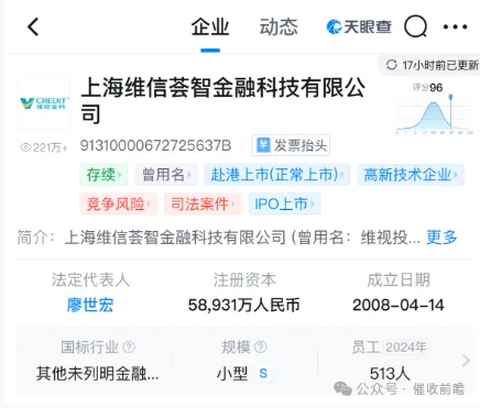 公开工商信息显示,涉事的上海维信荟智金融科技有限公司成立于 2008 年 4 月 14 日,法定代表人为廖世宏,注册资本达 58931 万人民币,是高新技术企业且已完成赴港上市,2024 年员工规模为 513 人,天眼查评分达 96 分,从资质与规模来看,属于具备行业影响力的金融科技企业。