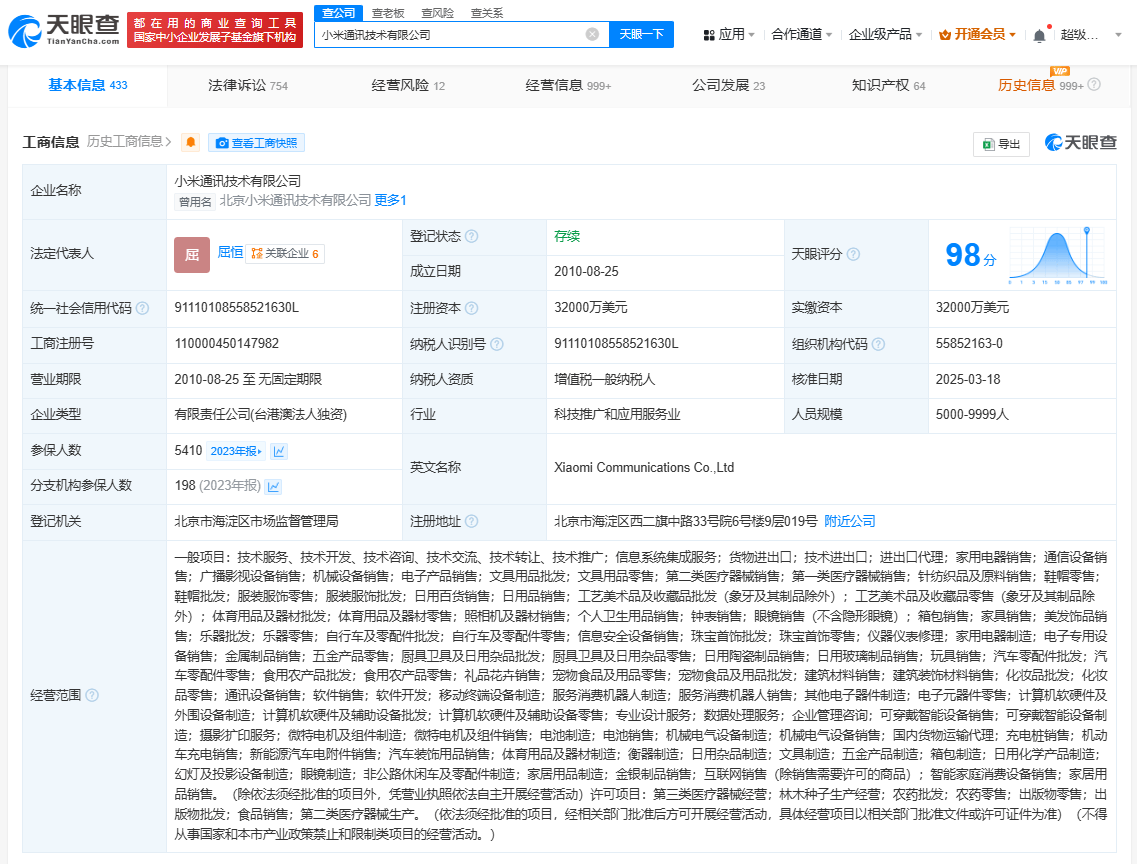 天眼查App显示,近日,小米通讯技术有限公司发生工商变更,经营范围新增金银制品销售、智能家庭消费设备销售等。