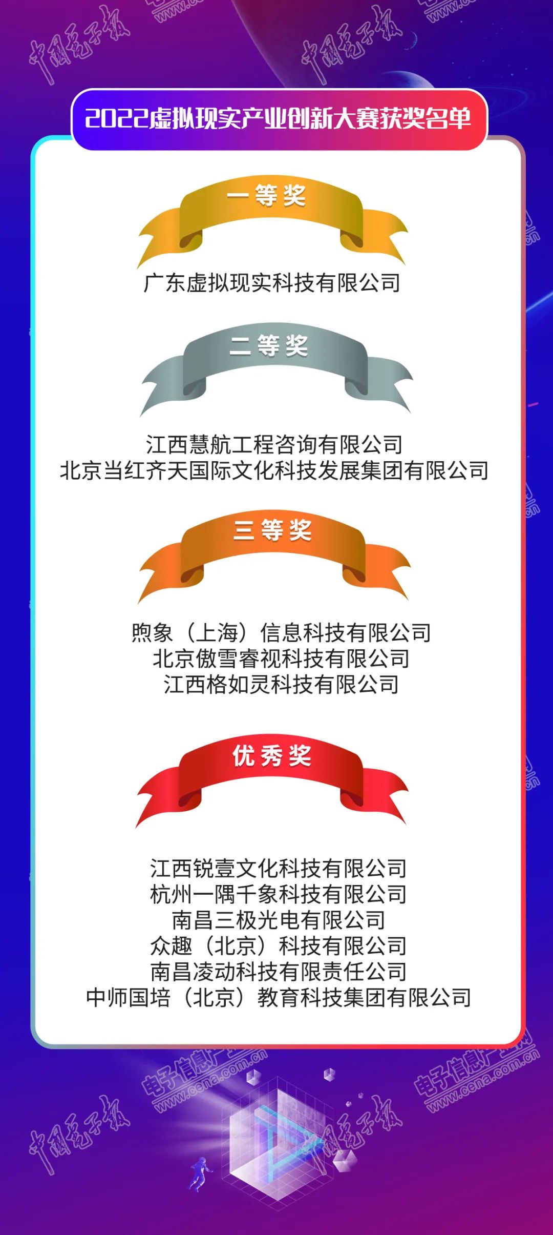 11月13日,由南昌市人民政府、江西省科学技术协会、江西省工业和信息化厅、虚拟现实产业联盟联合举办的2022虚拟现实产业创新大赛决赛在江西省南昌市红谷滩区举行。广东虚拟现实科技有限公司荣获一等奖,江西慧航工程咨询有限公司、北京当红齐天国际文化科技发展集团有限公司摘得二等奖,煦象(上海)信息科技有限公司、北京傲雪睿视科技有限公司、江西格如灵科技有限公司获得三等奖。