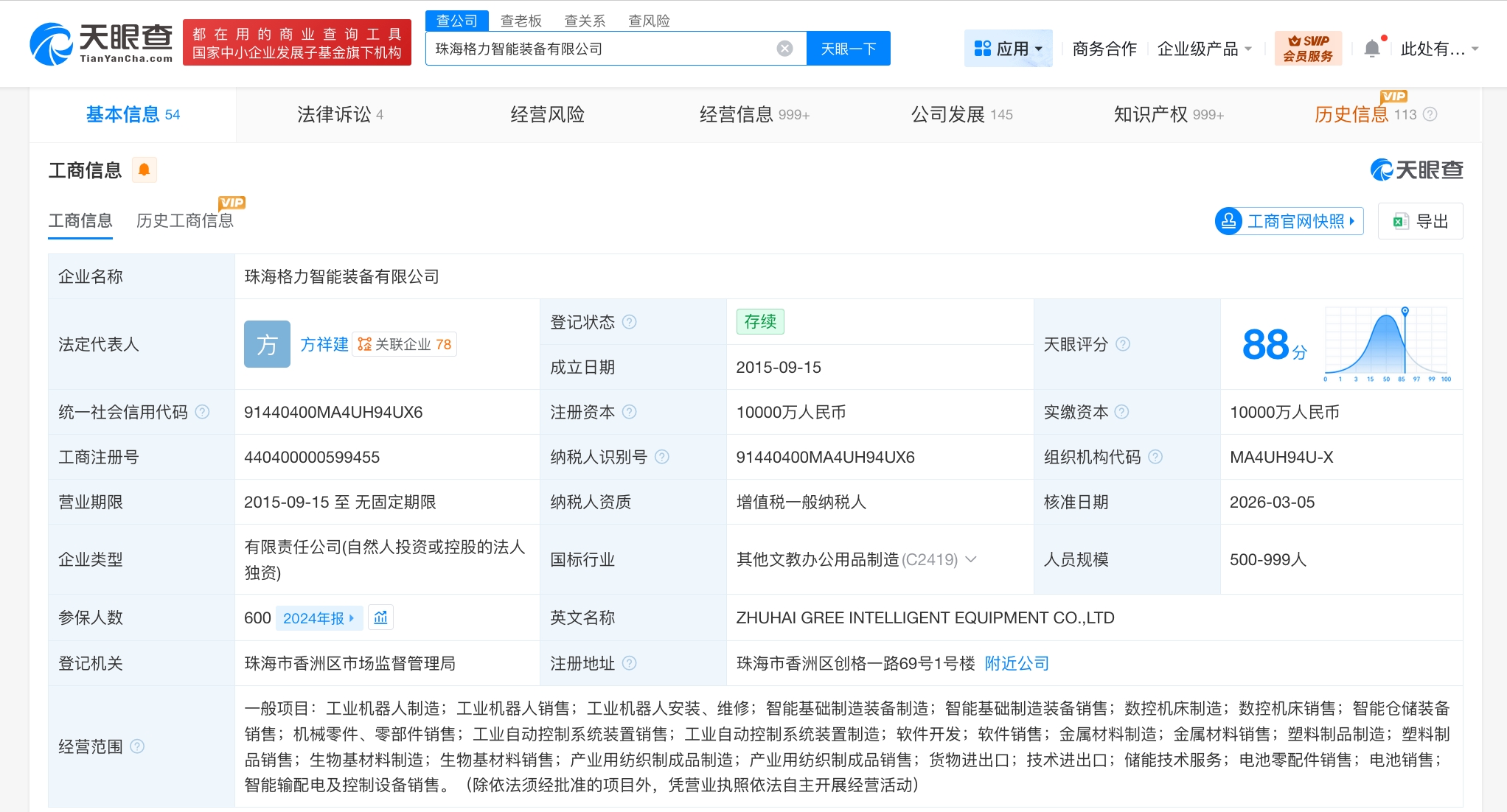天眼查工商信息显示,近日,珠海格力智能装备有限公司发生工商变更,钟成堡卸任法定代表人、执行董事、经理,方祥建接任法定代表人、执行公司事务的董事,钟明生接任经理。