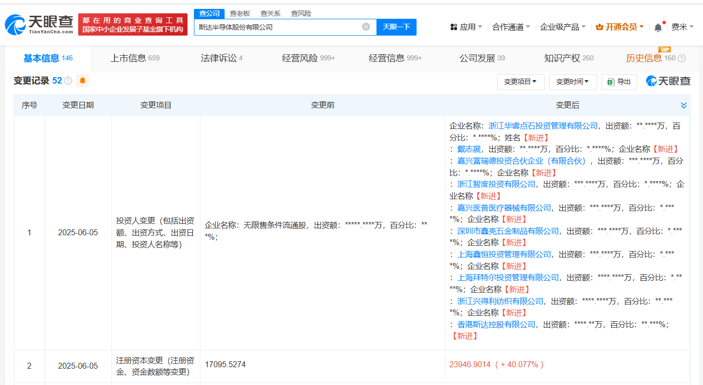 天眼查App显示,近日,斯达半导(603290)发生工商变更,注册资本由约1.7亿人民币增至约2.4亿人民币,增幅约40%。