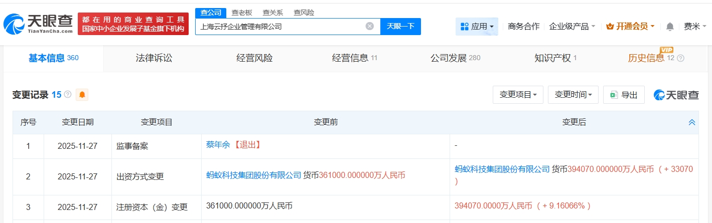 蚂蚁集团旗下云抒企业管理公司增资至39.4亿 增幅约9%观点