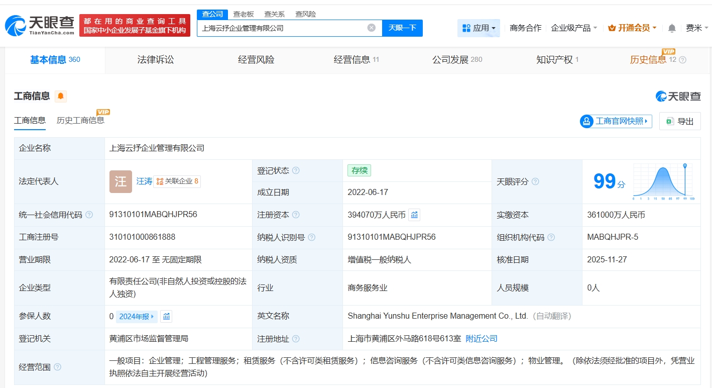 天眼查工商信息显示,近日,上海云抒企业管理有限公司发生工商变更,注册资本由36.1亿人民币增至约39.4亿人民币,增幅约9%。