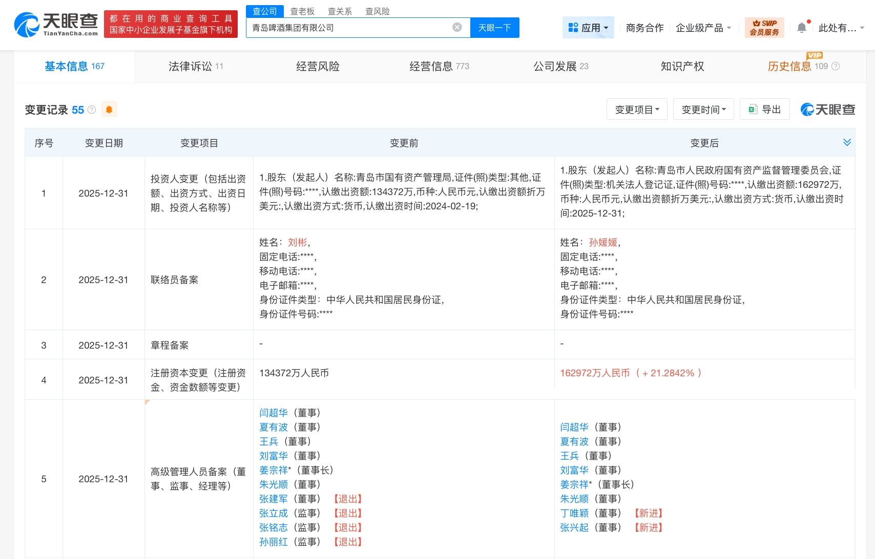 天眼查工商信息显示,近日,青岛啤酒集团有限公司发生工商变更,注册资本由约13.4亿人民币增至约16.3亿人民币,增幅约21%,同时,多位高管发生变更。