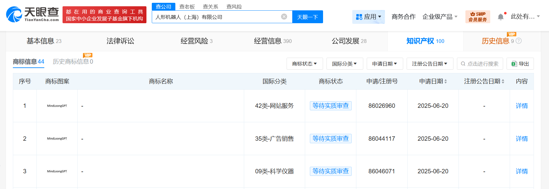 天眼查知识产权信息显示,近日,人形机器人(上海)有限公司申请注册“MindLoongGPT”商标,国际分类为科学仪器、网站服务、广告销售当前商标状态均为等待实质审查。