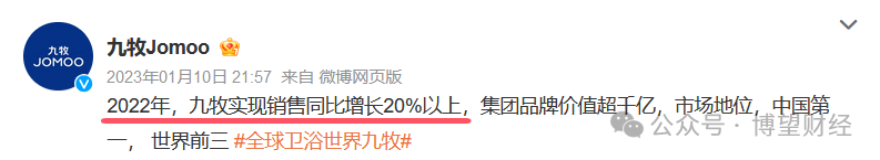 2023年12月,九牧集团董事长林孝发高调宣布,过去三年九牧集团累计销售额超过500亿元,平均增速超过30%。然而,这一数字似乎并没有经过第三方的严格审核,根据新视线的报道,九牧在2021年的销售额为152亿元,同比增长35%,以此为基准,可估算出2020年销售额约为112亿。再结合九牧照官方所述的20%增速来计算,2022年的销售额应该在182亿左右。简单加总会发现,数据远未达到三年累计销售超500亿元的规模。
