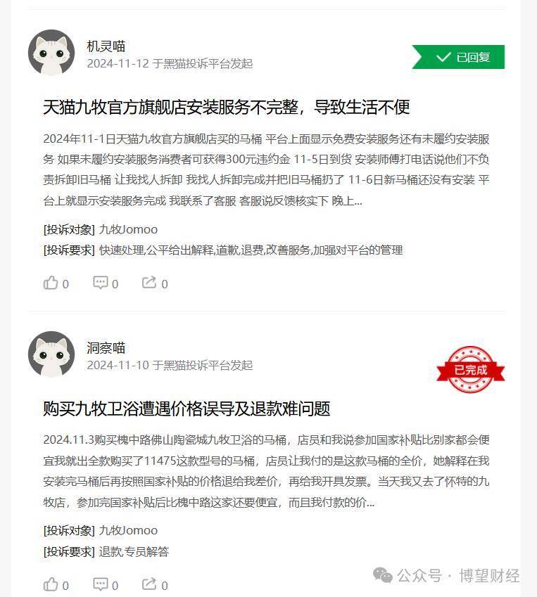 数据存疑之外,九牧卫浴的口碑也在近年来持续下滑。从产品质量到品控管理,再到安装收费及售后服务,九牧频繁受到用户和媒体的质疑。截至最近一次统计,黑猫投诉平台上九牧厨卫的投诉量已接近700件,而全国12315消费投诉信息公示系统中,涉及九牧品牌的投诉记录更是高达数千条。