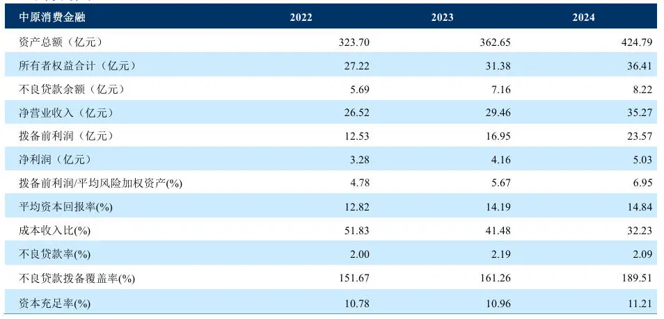 在资产质量方面,2022年至2024年,中原消费金融的不良率分别为2%、2.19%和2.09%。虽然2024年不良率有所改善,但信用减值损失持续攀升,2024年计提发放贷款和垫款信用减值损失为17.56亿元,同比大幅增长43.65%;不良贷款余额从2022年的5.69亿元增至2024年的8.22亿元,表明资产质量压力加大。