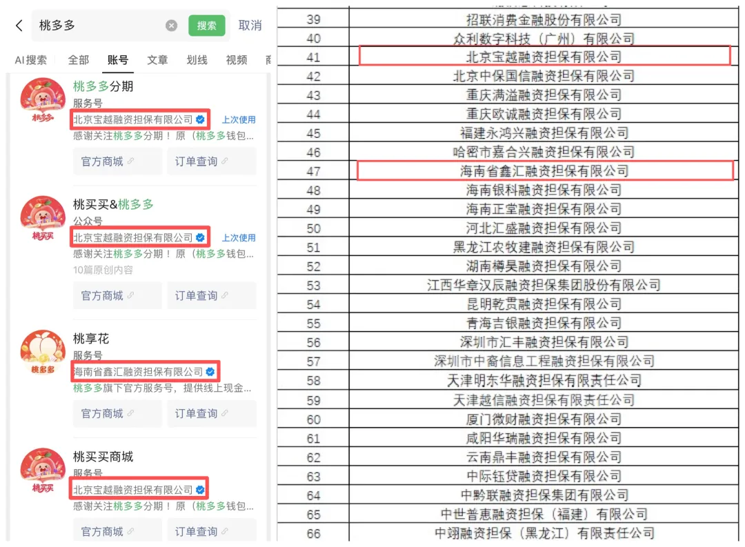 值得关注的是,北京宝越融资担保有限公司(下称“北京宝越”)、海南省鑫汇融资担保公司(下称“海南鑫汇”)均在名单之中,而这两家公司正是分期商城“桃多多”的运营方。