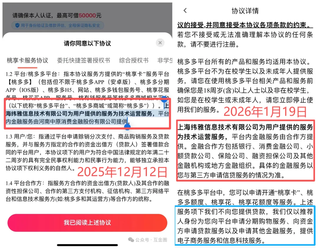 2025年12月12日,据「互金圈」报道,桃多多《服务协议》显示,“上海纬雅信息技术有限公司为用户提供的服务为技术运营服务,平台内金融服务则由河南中原消费金融股份有限公司提供”。从协议内容来看,桃多多主要做的是将用户导流给中原消费金融,由后者来放款。
