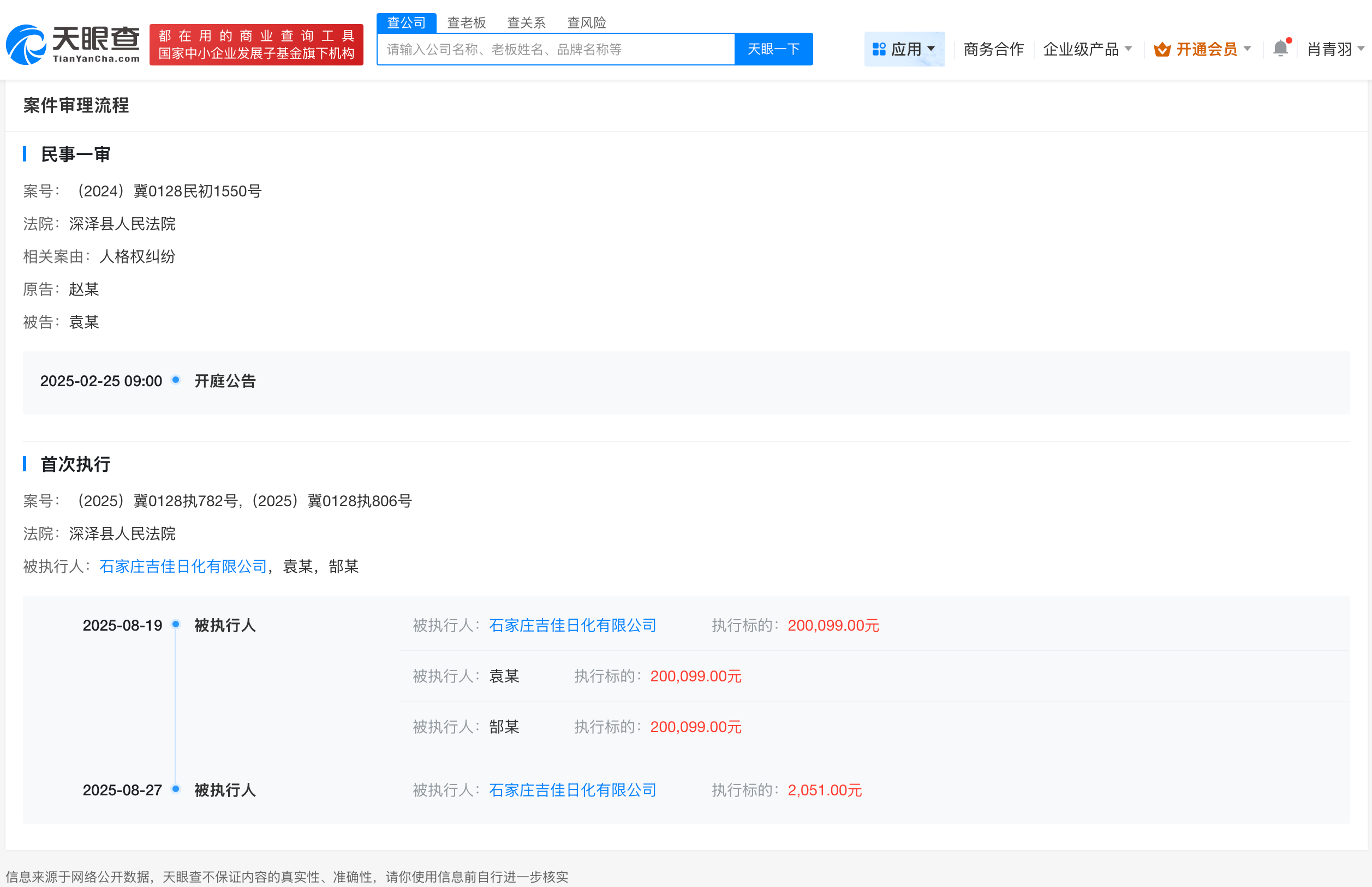 近日,石家庄吉佳日化有限公司新增一则被执行人信息,执行标的2051元,涉及赵丽颖与其人格权纠纷一案,执行法院为深泽县人民法院。