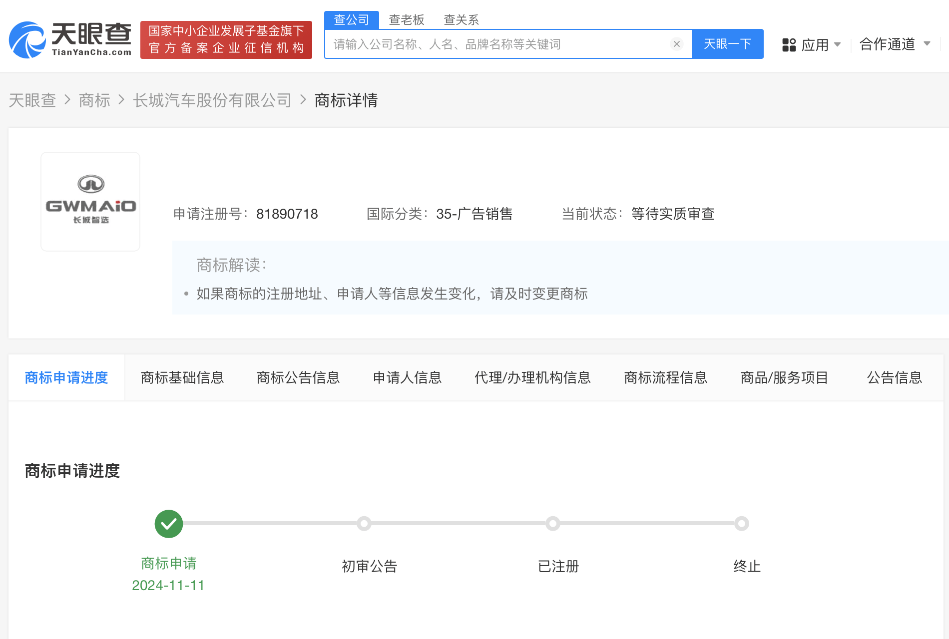 天眼查知识产权信息显示,近日,长城汽车股份有限公司申请注册2枚“GWMAiO 长城智选”商标,国际分类为广告销售、运输工具,当前商标状态均为等待实质审查。