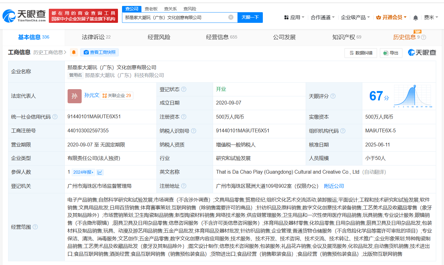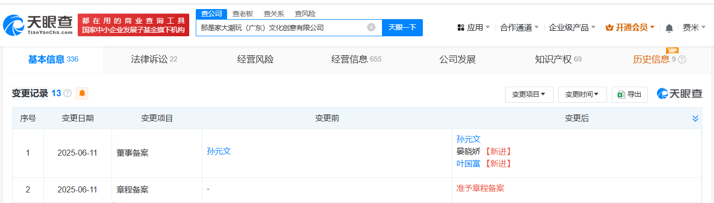 天眼查App显示,近日,那是家大潮玩(广东)文化创意有限公司发生工商变更,叶国富担任该公司董事长,同时部分高管发生变更。