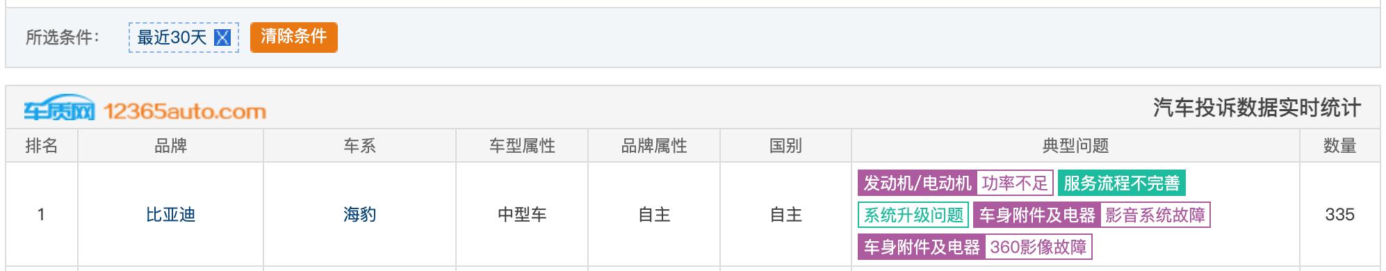 最近30天以及最近7天投诉量排行榜中,比亚迪海豹的投诉量分别为335条和296条,排名第一,典型问题包括发动机/电动机功率不足、影音系统故障、服务流程不完善等。