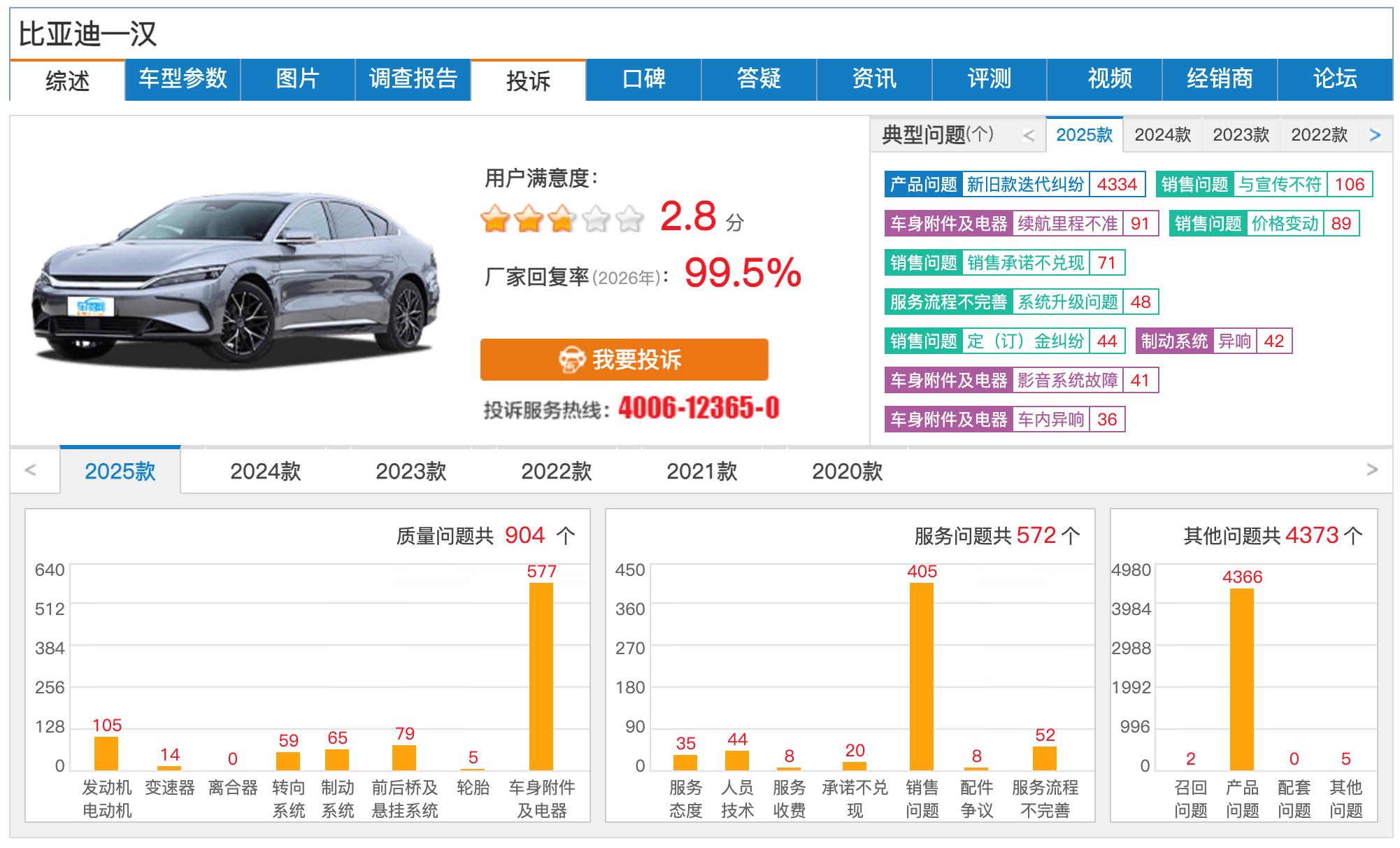 第三方汽车投诉处理及品质评价平台车质网也显示,最近一年、最近30天以及最近7天车辆投诉量排行榜中,比亚迪均排名第一。其中最近一年,比亚迪汉以1390条投诉量位列榜首,典型问题包括新旧款迭代纠纷、座椅故障、与宣传不符等。