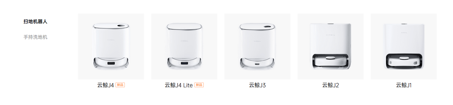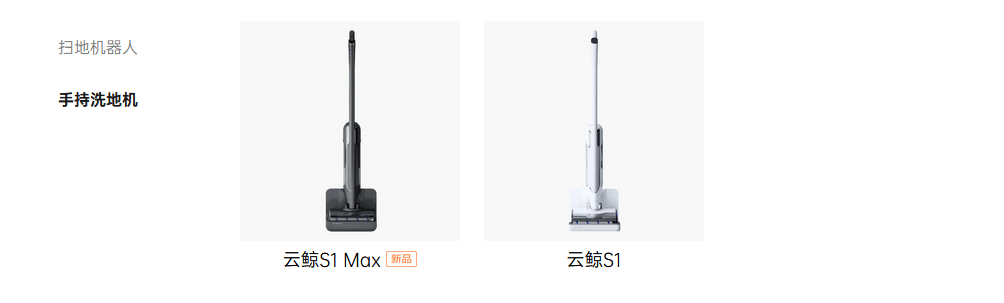 相较另外三个产品线覆盖更全的竞争对手,云鲸专注于扫地机器人和手持洗地机两个品类,其中扫地机的迭代由J1到J4;手持洗地机的两款产品分别为S1 Max和S1。