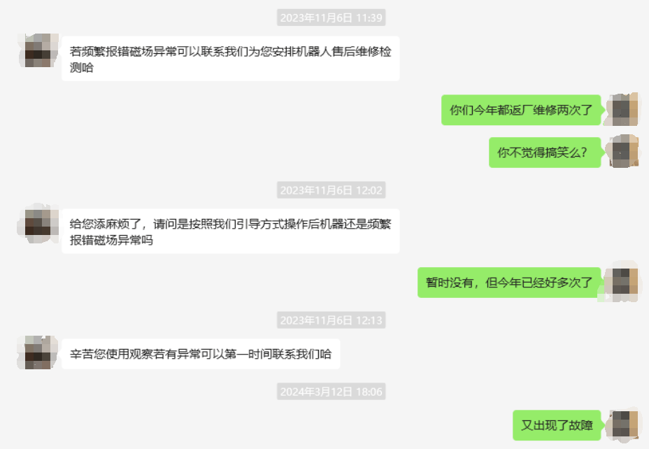 他告诉记者,机器刚出保就发生故障,他按照客服要求自费寄回维修(更换零件);修理回来后大概过了5个月左右,机器又出现了相同的故障,经过多番沟通,云鲸方面同意了半价维修(更换零件);第二次修理回来后的4个月左右,机器再次出现相同问题。表现为“机器不能运转,App提示磁场异常”。