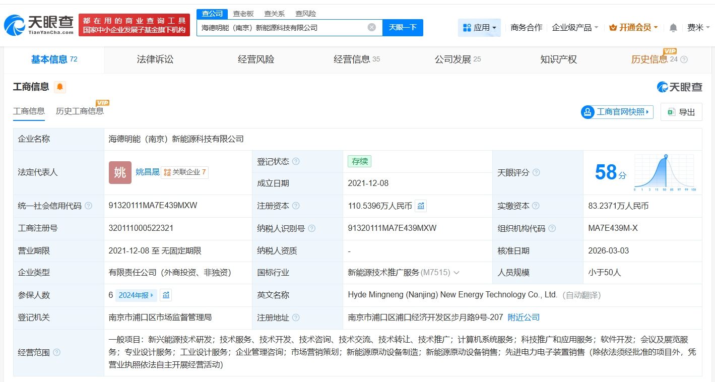 海德明能(南京)新能源科技有限公司成立于2021年12月,法定代表人为姚昌晟,经营范围包括新兴能源技术研发、新能源原动设备制造、新能源原动设备销售等。股东信息显示,该公司现由南京戊辇企业管理合伙企业(有限合伙)、南京襄久创业投资合伙企业(有限合伙)及上述新增股东等共同持股。