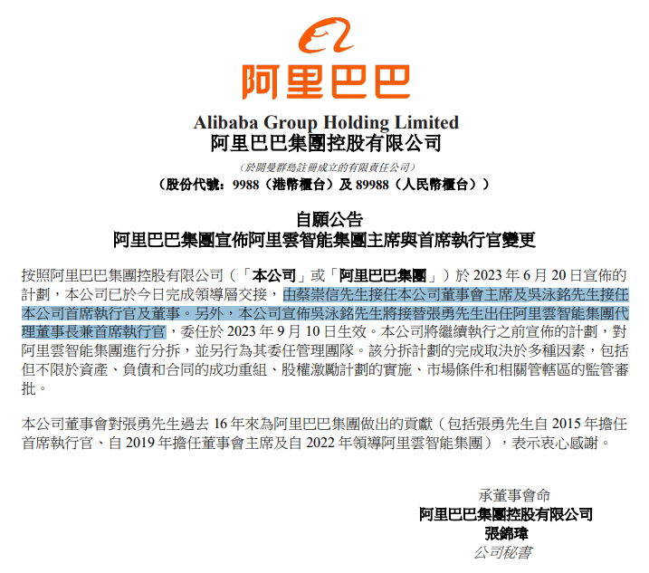 最大的变动是公司时任董事会主席、兼首席执行官的张勇。6月20日,阿里巴巴官宣蔡崇信、吴泳铭分别接任张勇的集团主席、集团首席执行官职务,委任将于9月10日生效,这也是阿里的传统。