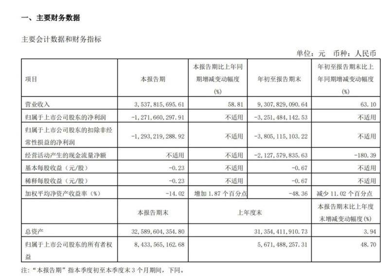 日前,北汽蓝谷发布了2023年第三季度报告,报告显示,公司前三季度营业收入93.08亿元,同比增长63.1%;归属于母公司所有者的净利润亏损32.51亿元,上年同期净亏损35亿元,亏损略有缩窄;其中,第三季度实现营业收入35.38亿元,同比增长58.81%,归属于母公司所有者的净利润亏损12.72亿元,上年同期净亏损13.18亿元,有小幅缩窄。从整体数据来看,虽然北汽蓝谷今年三季度和前三季度都仍旧处于亏损中,但与去年同期比较财务指标开始向好。
