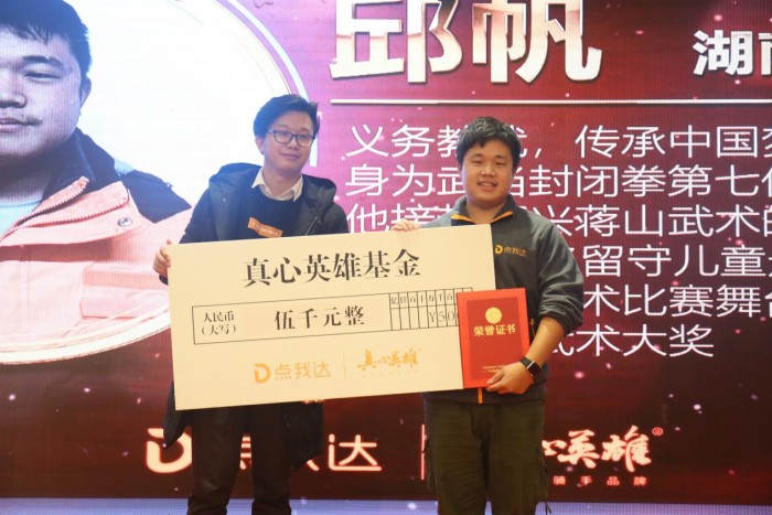 来自长沙的武术小哥邱帆,一边送外卖,一边义务带着20多个留守孩子习武,并登上了国际武术比赛的舞台,斩获了多个金牌,他的故事被央视拍成了纪录片。他在现场代表点我达的“真心英雄”获奖者发表了演讲:“我有一番理想和抱负,点我达骑手这个工作虽然普通,但是它既能够让我自食其力,也能让我有时间帮助山里的那群孩子们,带他们看更大的世界。”