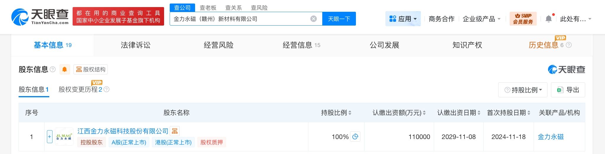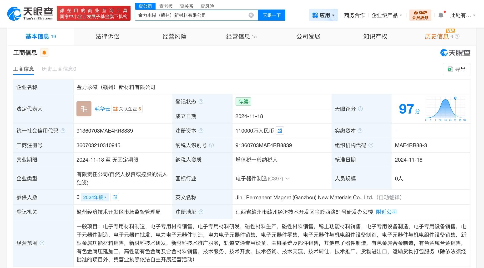 该公司成立于2024年11月,法定代表人为毛华云,经营范围含电子专用材料制造、电子专用材料销售、电子专用材料研发、磁性材料生产、磁性材料销售、稀土功能材料销售、电子专用设备制造等。股东信息显示,该公司由金力永磁(300748)全资持股。
