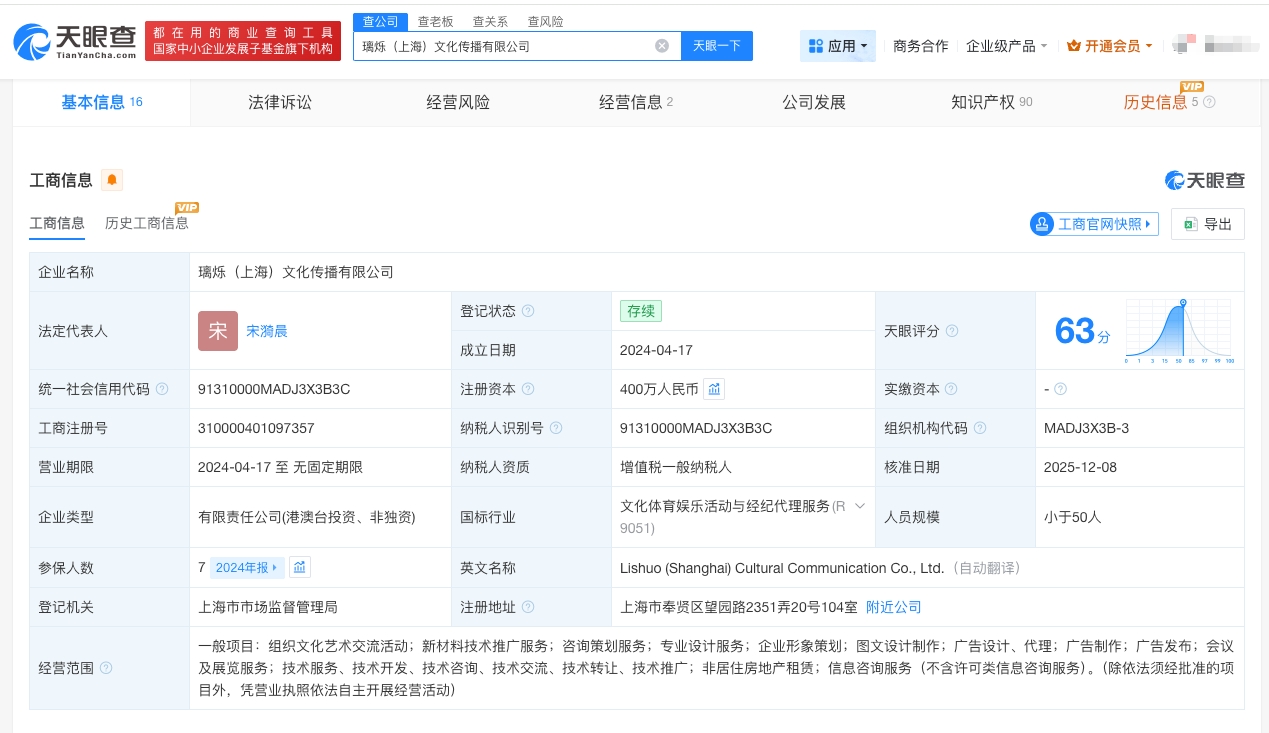 天眼查显示,璃烁(上海)文化传播有限公司成立于2024年4月17日,法定代表人为宋漪晨,注册资本400万人民币。知识产权信息显示,该公司已申请注册多枚“伊能静”商标,目前商标状态多为等待实质审查。
