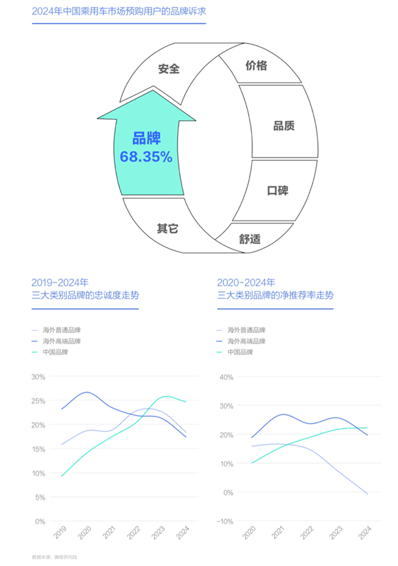 报告显示,2019年中国品牌的用户忠诚度不及10%,大幅落后于海外品牌,其中海外普通品牌和海外高端品牌(主流合资和传统豪华品牌)分别超过15%和23%,之后中国品牌的用户忠诚度持续提升,并于2023年一举超越海外品牌,2024年中国品牌仍维持在25%左右的水平,海外品牌则加速下滑。