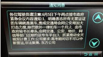 南京的出租车司机们收到的由公司发来的通知至少证明了以滴滴为代表的网约车公司在南京市场承受的压力。通知提到了3点,“6月5日下午接市政府紧急会议通知:1、明确表态所有无营运证的车辆就是黑车,责成交通局会同公安局加大打击力度,除罚款外一律扣车一个月;2、由市政府秘书长牵头,会同交通、公安、物价、网信等部门近期约谈专车平台;3、抓紧推动全天候双计费工作 高考期间切不可以中断营运,非法聚集。”