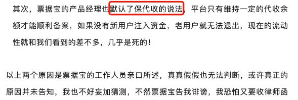 最后还是希望票据宝对待投资人可以拿出更多的诚意,这样才会得到投资人的支持,才有机会渡过难关。