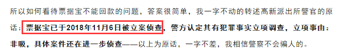 另外“书生读财”还表示,票据宝已于2018年11月6日被立案侦查。