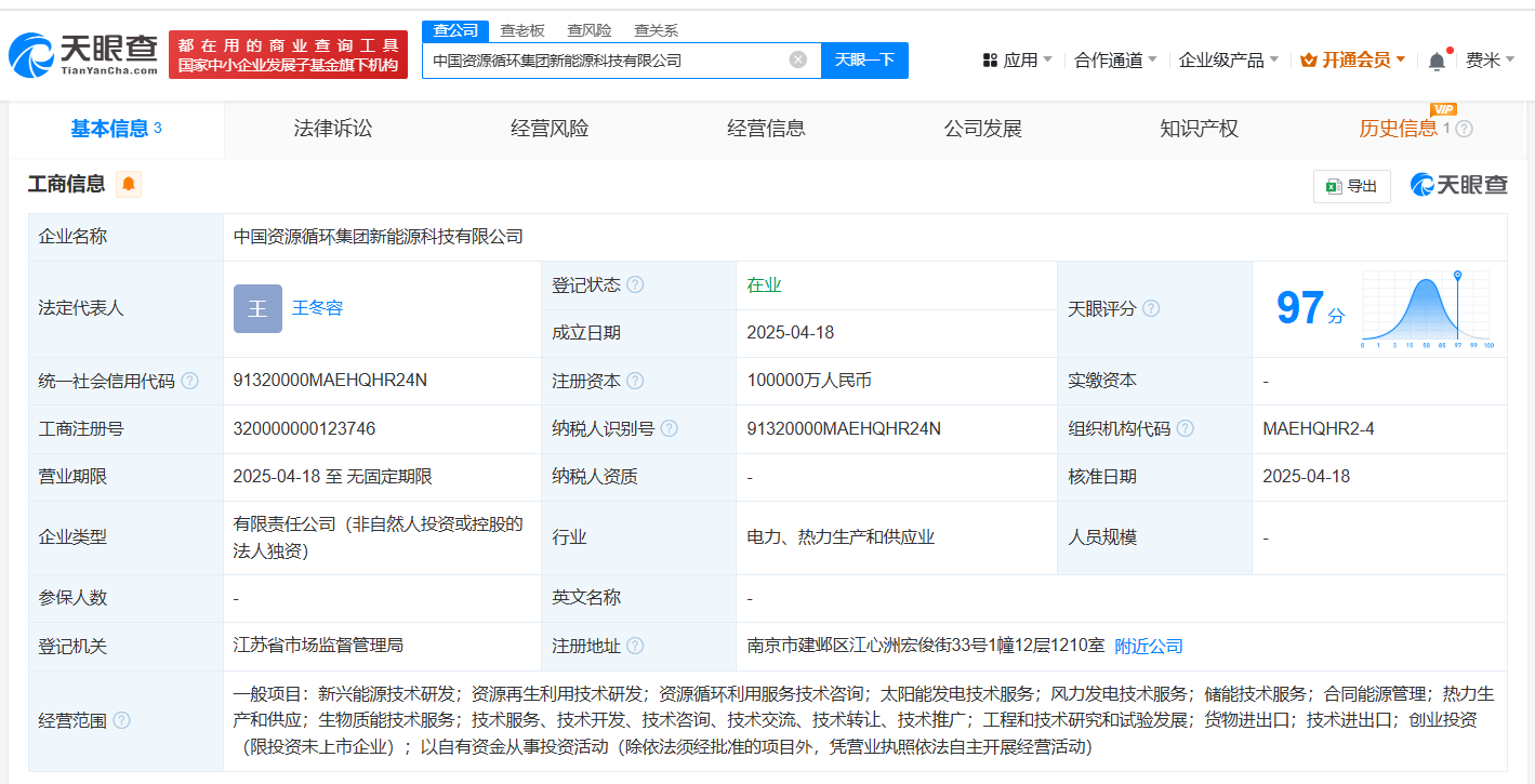 天眼查App显示,4月18日,中国资源循环集团电子电器有限责任公司、中国资源循环集团新能源科技有限公司、中国资源循环集团绿色纤维有限责任公司成立,法定代表人分别为廖欢乐、王冬容、陈世杰,注册资本均为10亿人民币,经营范围分别包括再生资源回收、资源再生利用技术研发、高性能纤维及复合材料销售等。股东信息显示,上述三家公司均由中国资源循环集团有限公司全资持股。