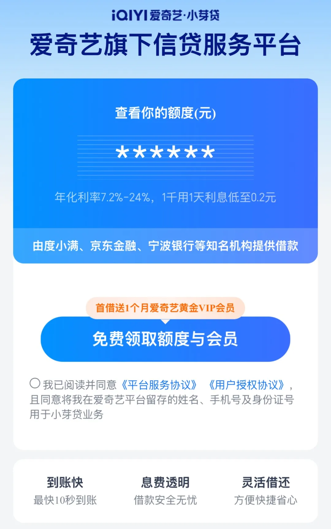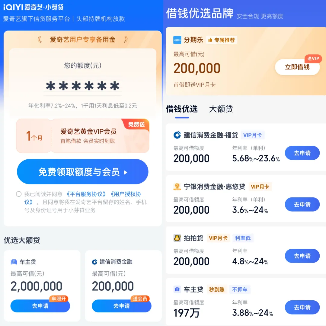 打开爱奇艺APP,除了热剧综艺,“钱包”栏目里的借贷广告已成为高频弹窗。“首借送1个月VIP会员”、“最快10秒到账,1千用1天利息低至0.2元”。以长视频为标签的爱奇艺,正在通过助贷业务上演一场流量变现的狂飙。