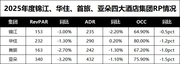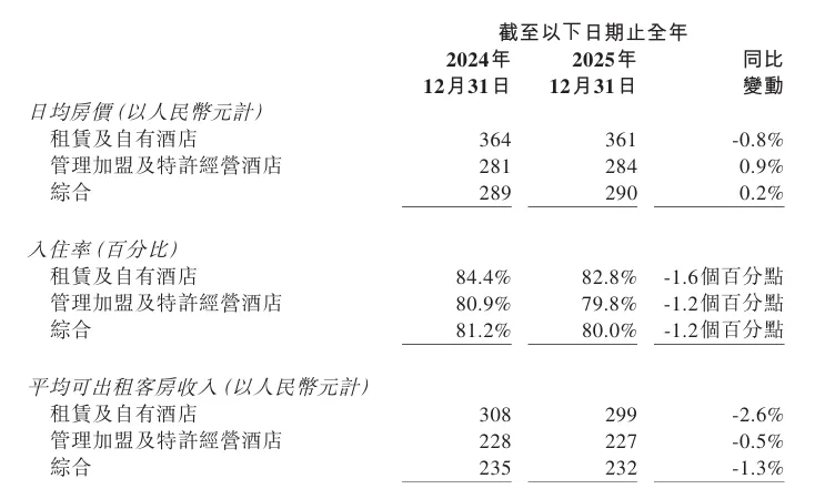 财报显示,2025年全年,华住中国旗下酒店的平均每日房价为290元,几乎没涨;更关键的指标——平均可出租客房收入,却下降1.3%至232元,入住率下降1.2个百分点至80%。