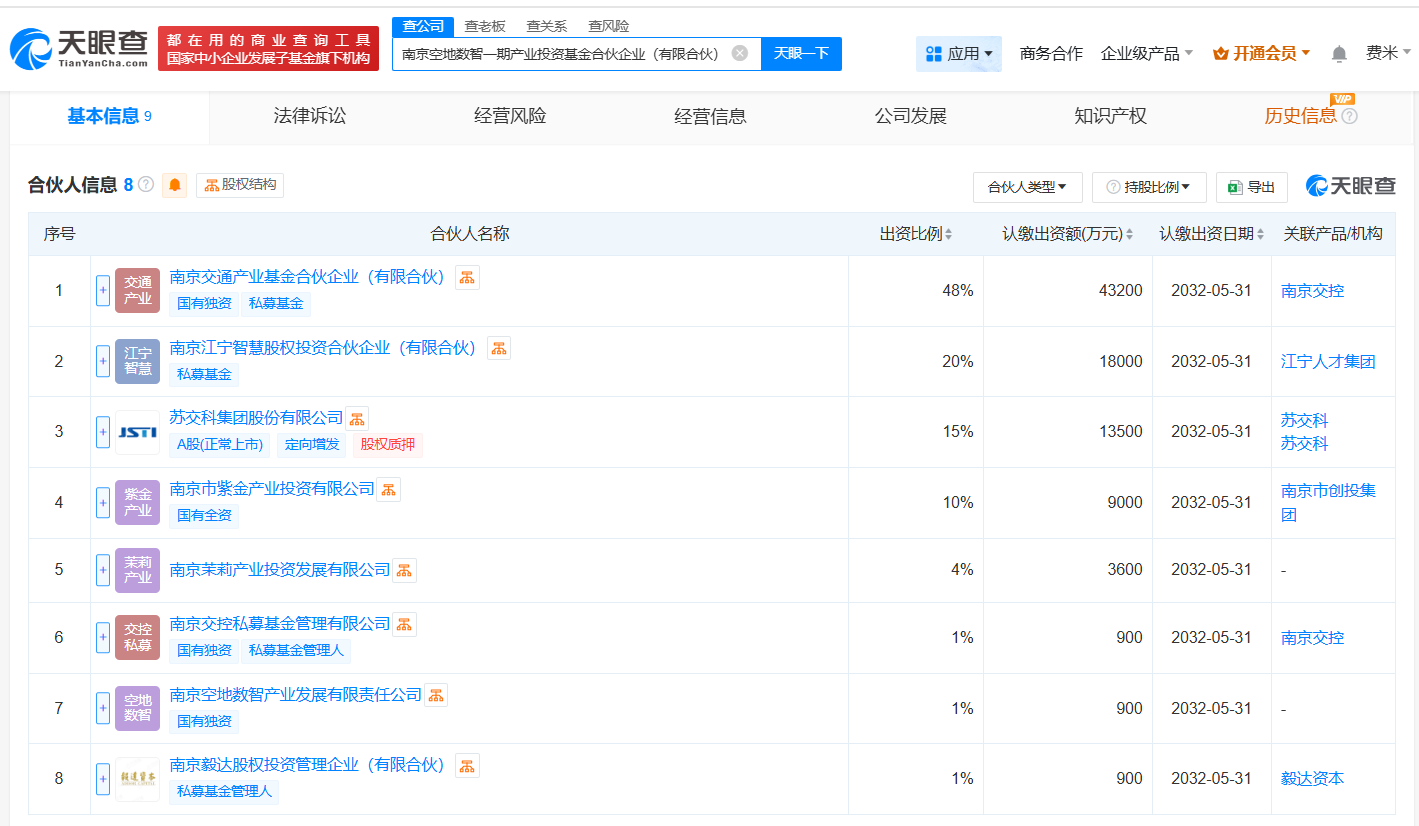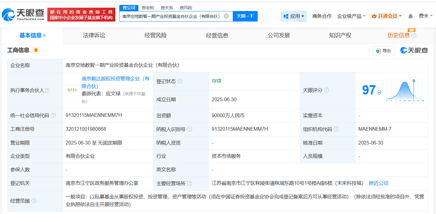 天眼查App显示,近日,南京空地数智一期产业投资基金合伙企业(有限合伙)成立,执行事务合伙人为南京毅达股权投资管理企业(有限合伙),出资额9亿人民币,经营范围为以私募基金从事股权投资、投资管理、资产管理等活动,由南京市紫金产业投资有限公司、苏交科(300284)、南京空地数智产业发展有限责任公司等共同出资。